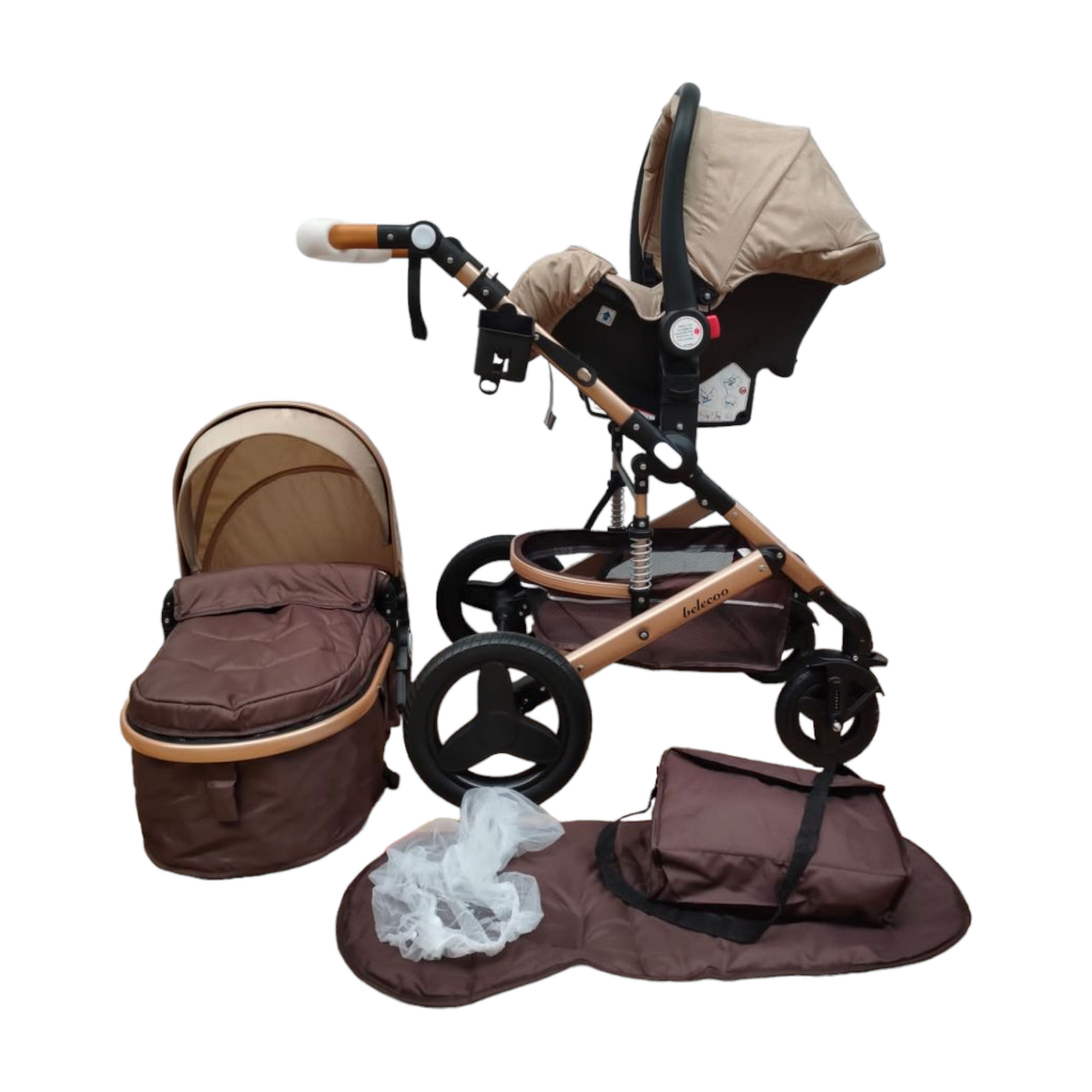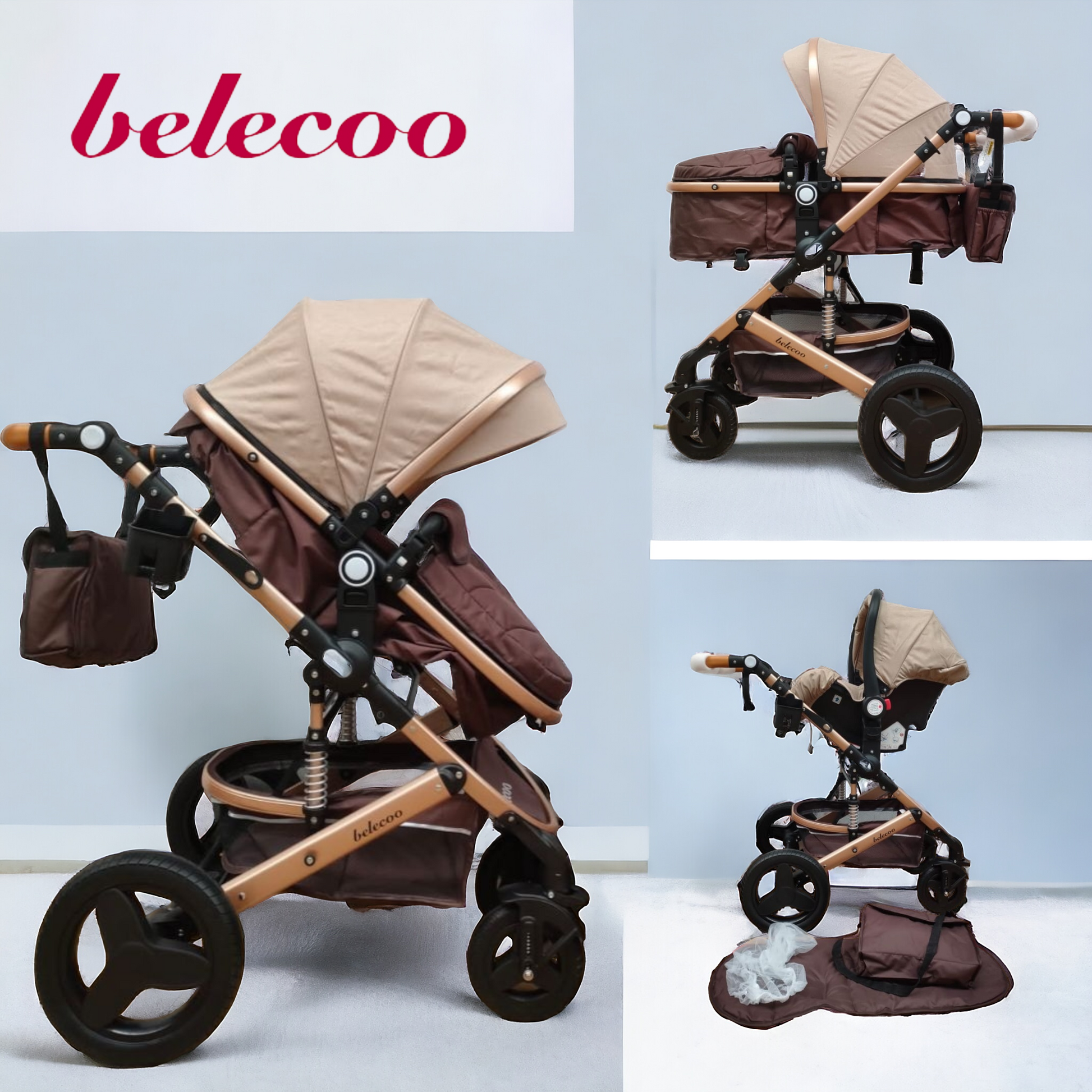 Carucior Belecoo 3 in 1 cu suspensii si roti cauciuc plin, reversibil, accesorizat culoare bej/maro BBD530WBM