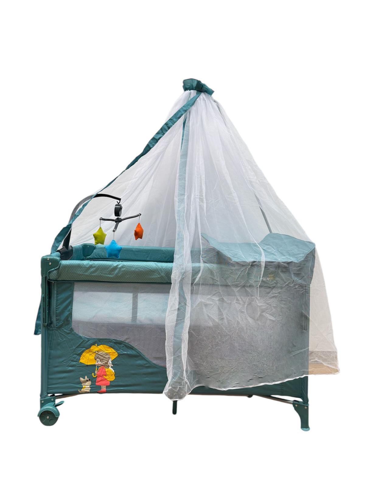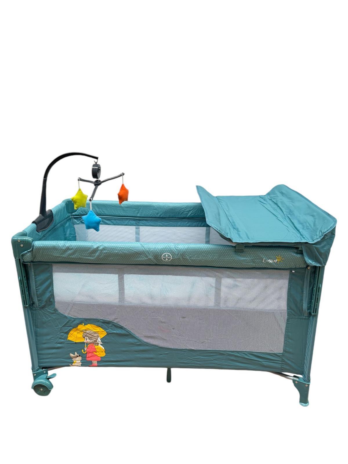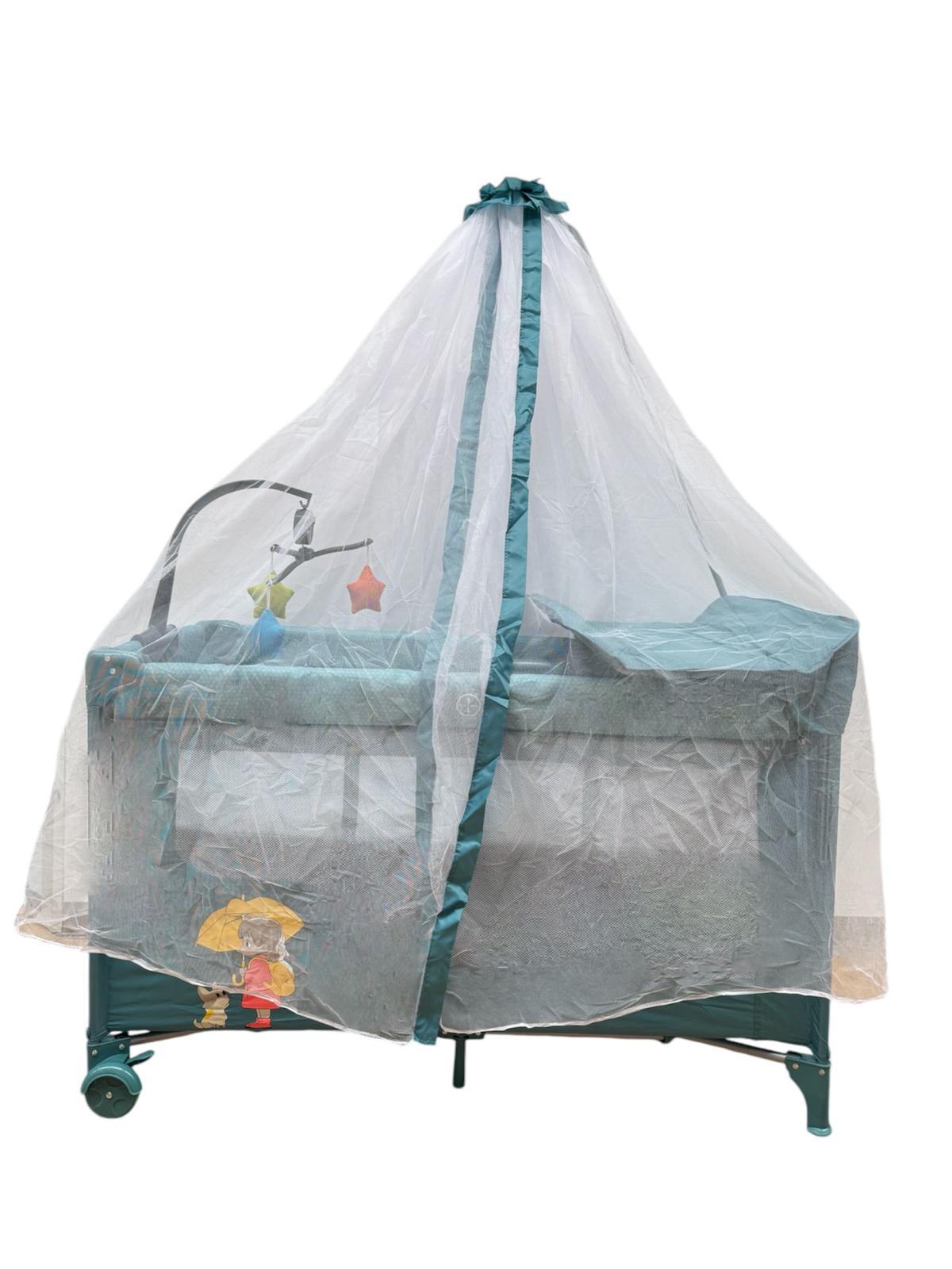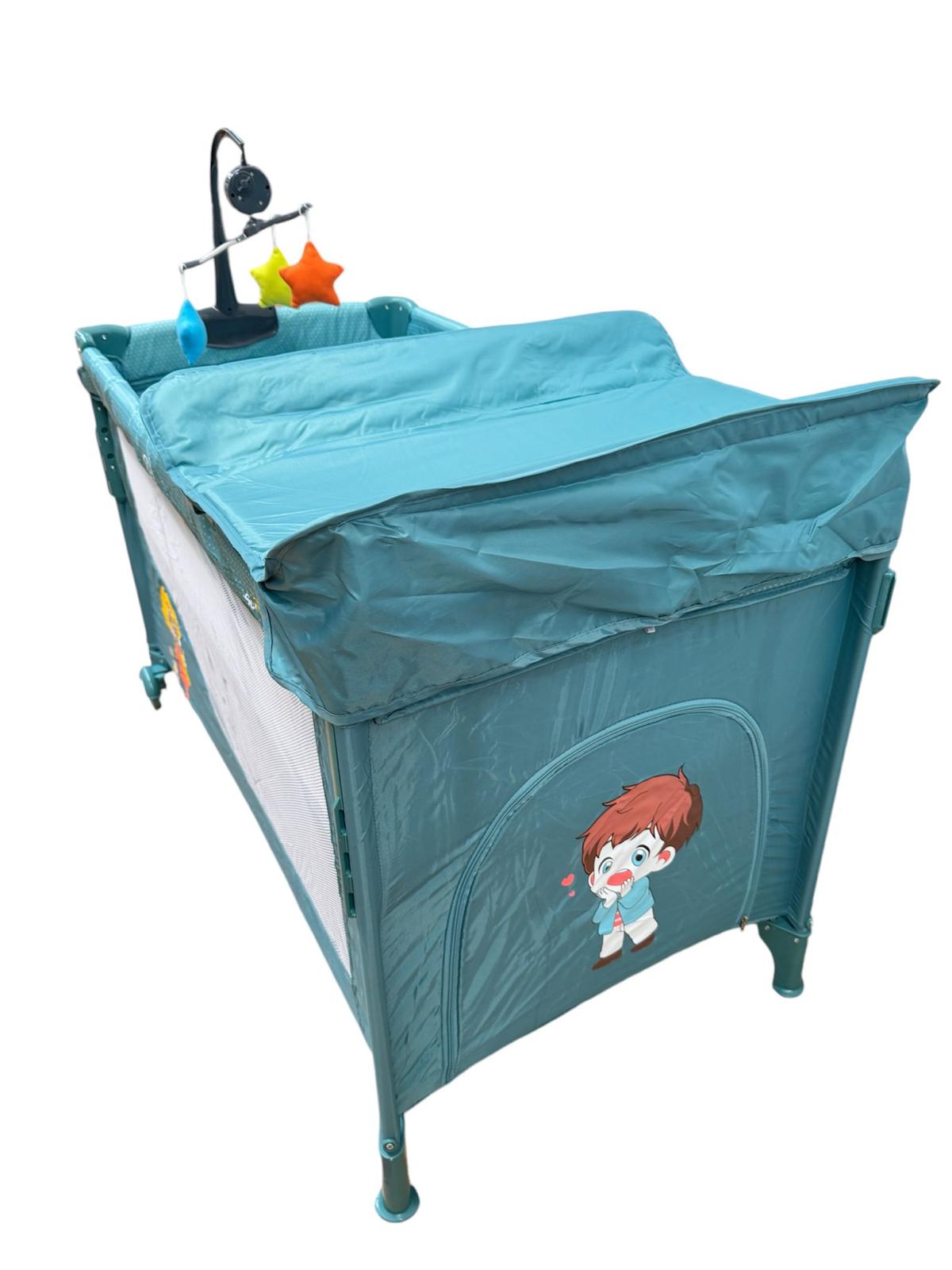 Patut pentru bebelusi cu baldachin,BBDP01 , laterala pliabila cu masa de infasat si carusel ,ALBASTRU