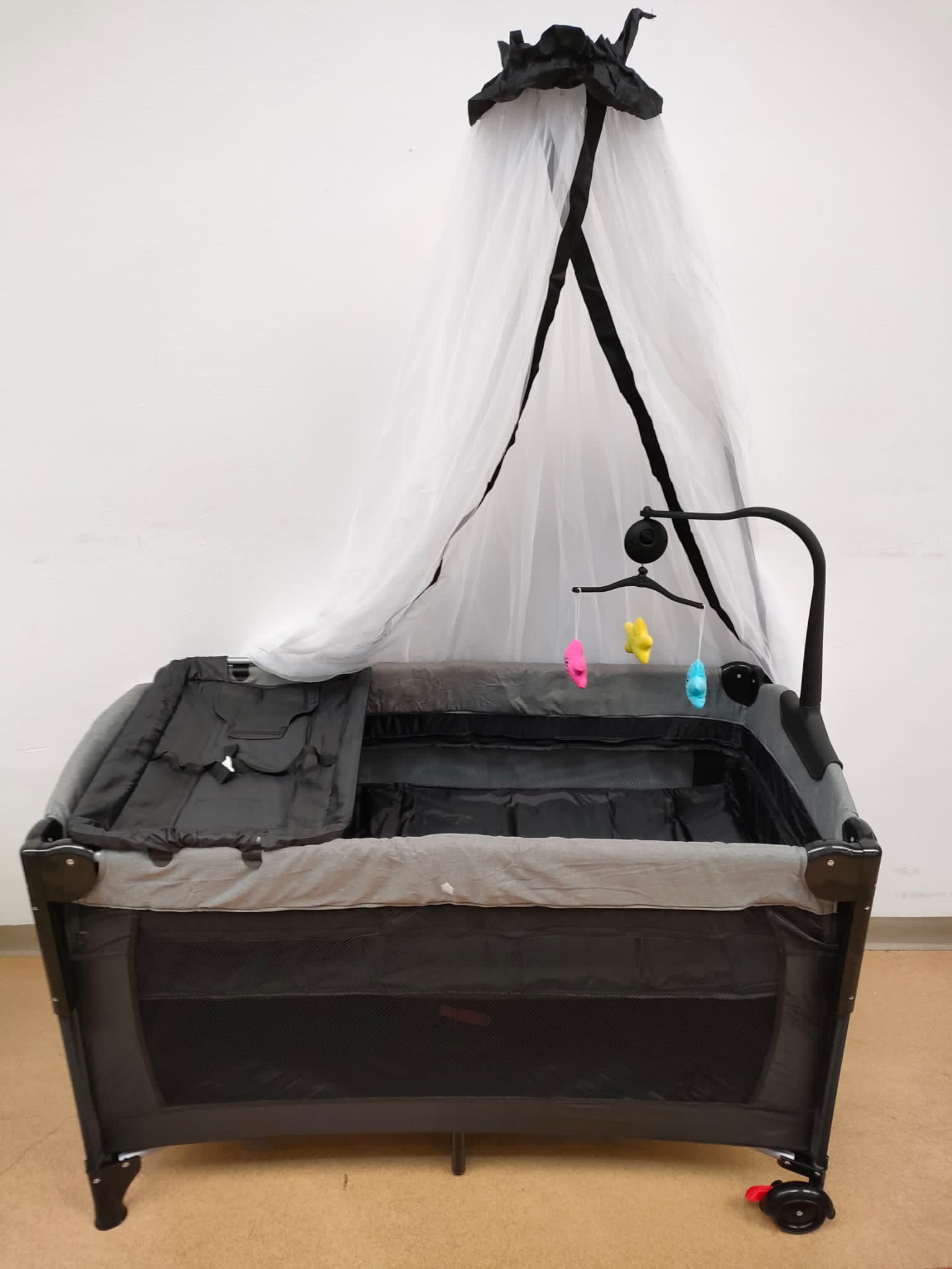 Patut pentru bebelusi cu baldachin , laterala pliabila cu masa de infasat si carusel ,GRI GGBT1G