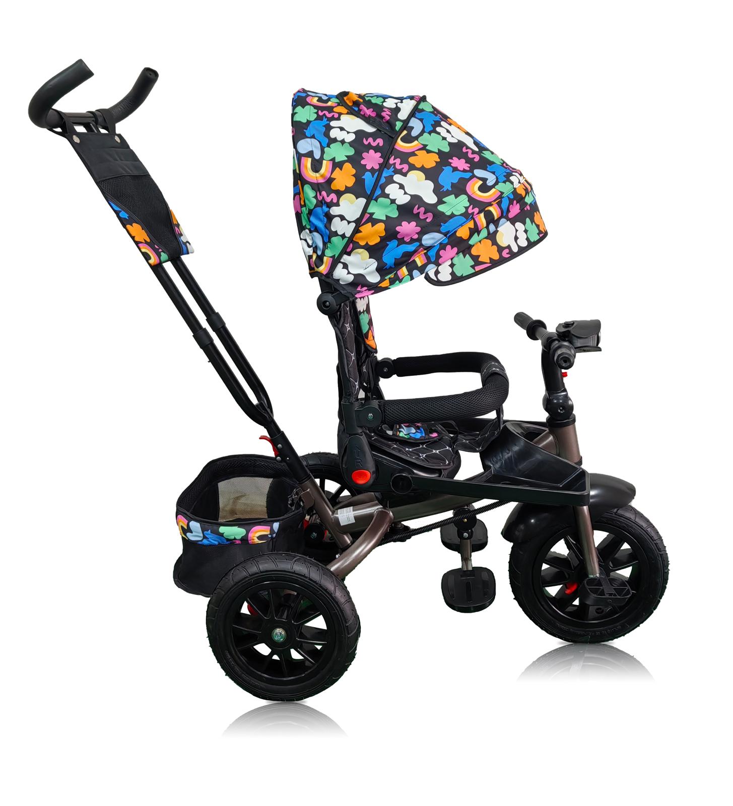 Tricicleta roti cauciuc plin, cu pozitie somn, scaun rotativ, muzica si lumini,culoare CURCUBEU