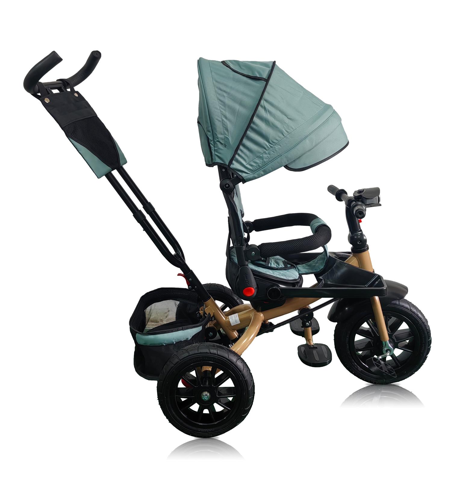 Tricicleta roti cauciuc plin, cu pozitie somn, scaun rotativ, muzica si lumini,culoare VERDE CADRUL AURIU